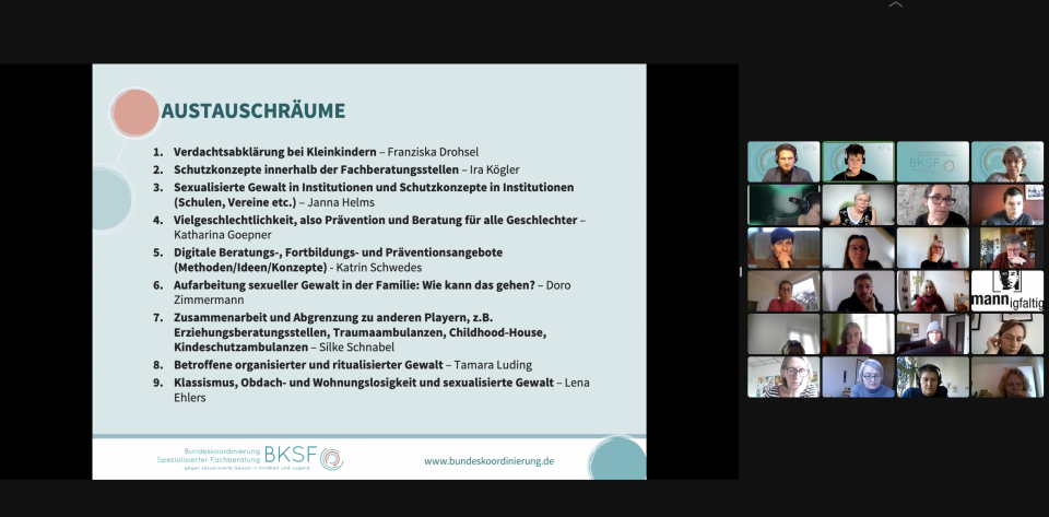 Für die Dokumentation haben die Moderator*innen der Breakout-Räume die Diskussionen zusammengefasst. Neben zentralen Fragestellungen, Kontroversen und Erkenntnissen stehen dabei die Wünsche und Aufträge an die BKSF im Fokus, die sich in der Gruppenarbeit herauskristallisierten.