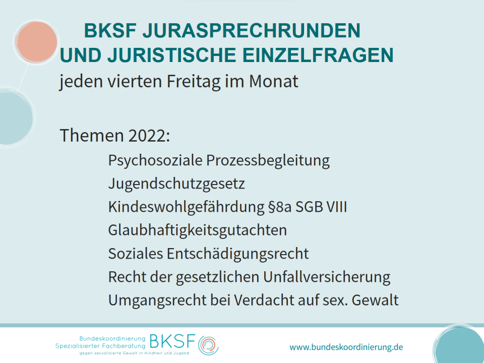 Die Jura-Sprechrunde der BKSF wurde auch im Jahr 2022 fortgeführt und fand am vierten Freitag jeden Monats statt. In dieser Reihe bereitete unsere juristische Referentin, Franziska Drohsel, verschiedene Themen mit kleinen Fallbeispielen vor und diskutierte diese mit den teilnehmenden Fachberater*innen. Im Jahr 2022 fanden insgesamt neun Jura-Sprechrunden zu folgenden Themen statt: psychosoziale Prozessbegleitung, das Jugendschutzgesetz, Kindeswohlgefährdung nach § 8a SGB VIII, Glaubhaftigkeitsgutachten, soziales Entschädigungsrecht, Recht der gesetzlichen Unfallversicherung und das Umgangsrecht bei Verdacht auf sexualisierte Gewalt.