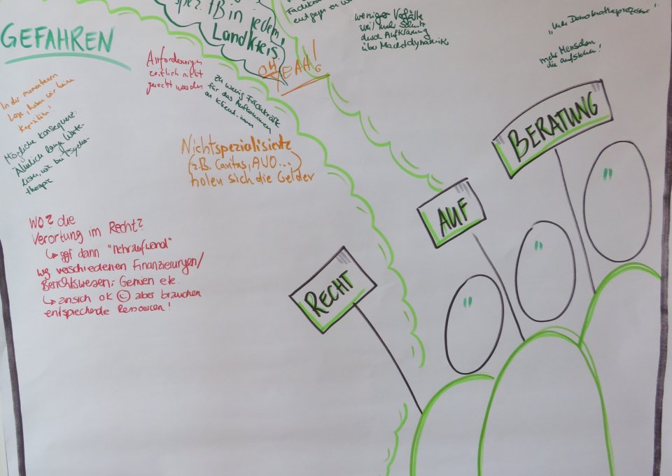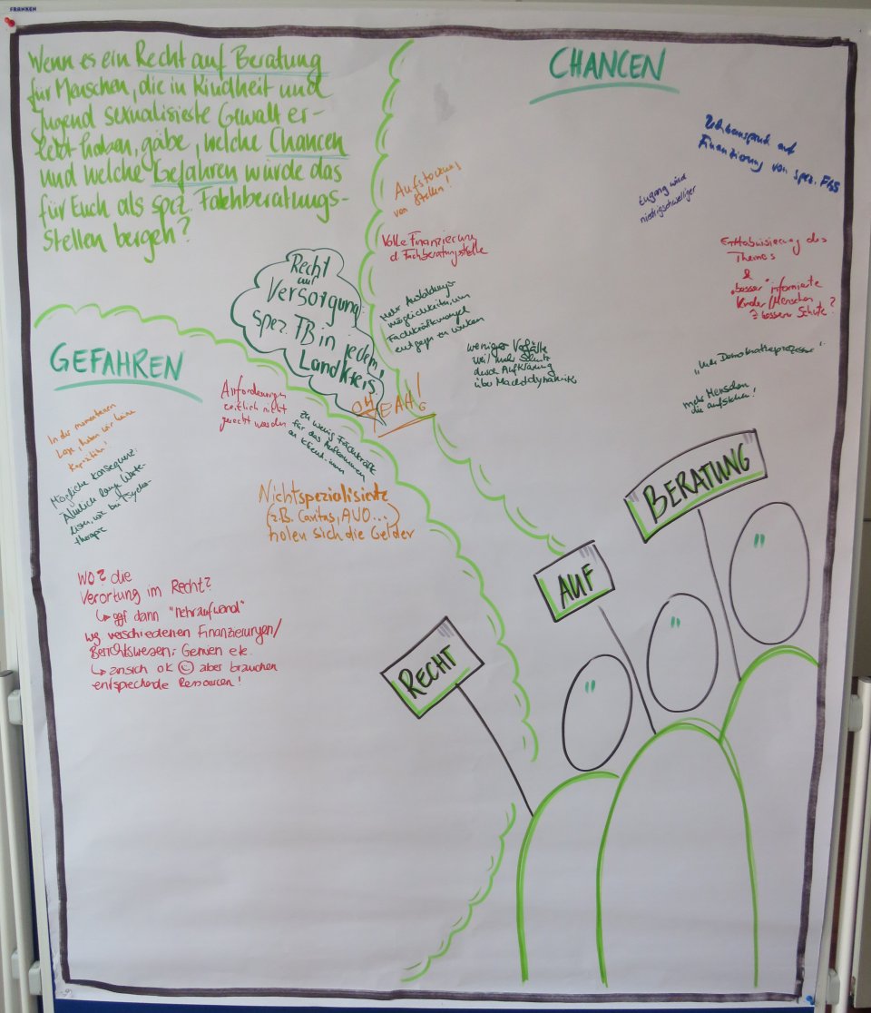 Im Anschluss erläuterte Franziska Drohsel (juristische Referentin der BKSF) verschiedene rechtliche Aspekte. Gegenwärtig besteht bereits ein gesetzlicher Anspruch auf Beratung gemäß § 8 SGB VIII, der jedoch auf Kinder und Jugendliche beschränkt ist und nicht das Recht auf Beratung durch eine spezialisierte Fachberatungsstelle beinhaltet. Anschließend erörterte sie die Problemstellungen, die bei der Formulierung eines solchen Anspruchs berücksichtigt werden müssten.