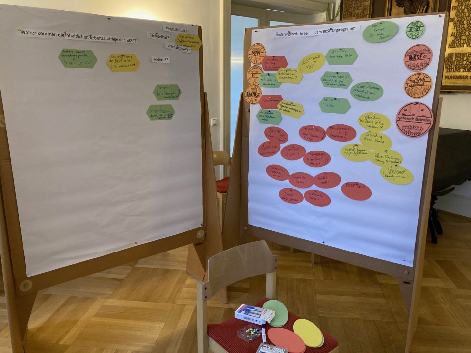 Nach der Runde im Plenum folgt die Aufteilung in Kleingruppen, in denen die bisherige Arbeit der BKSF evaluiert wird. Hierbei wird auf verschiedenen Stellwänden festgehalten, welche Aspekte von den Berater*innen als hilfreich wahrgenommen und beibehalten werden sollen und wo Weiterentwicklungsbedarf besteht.